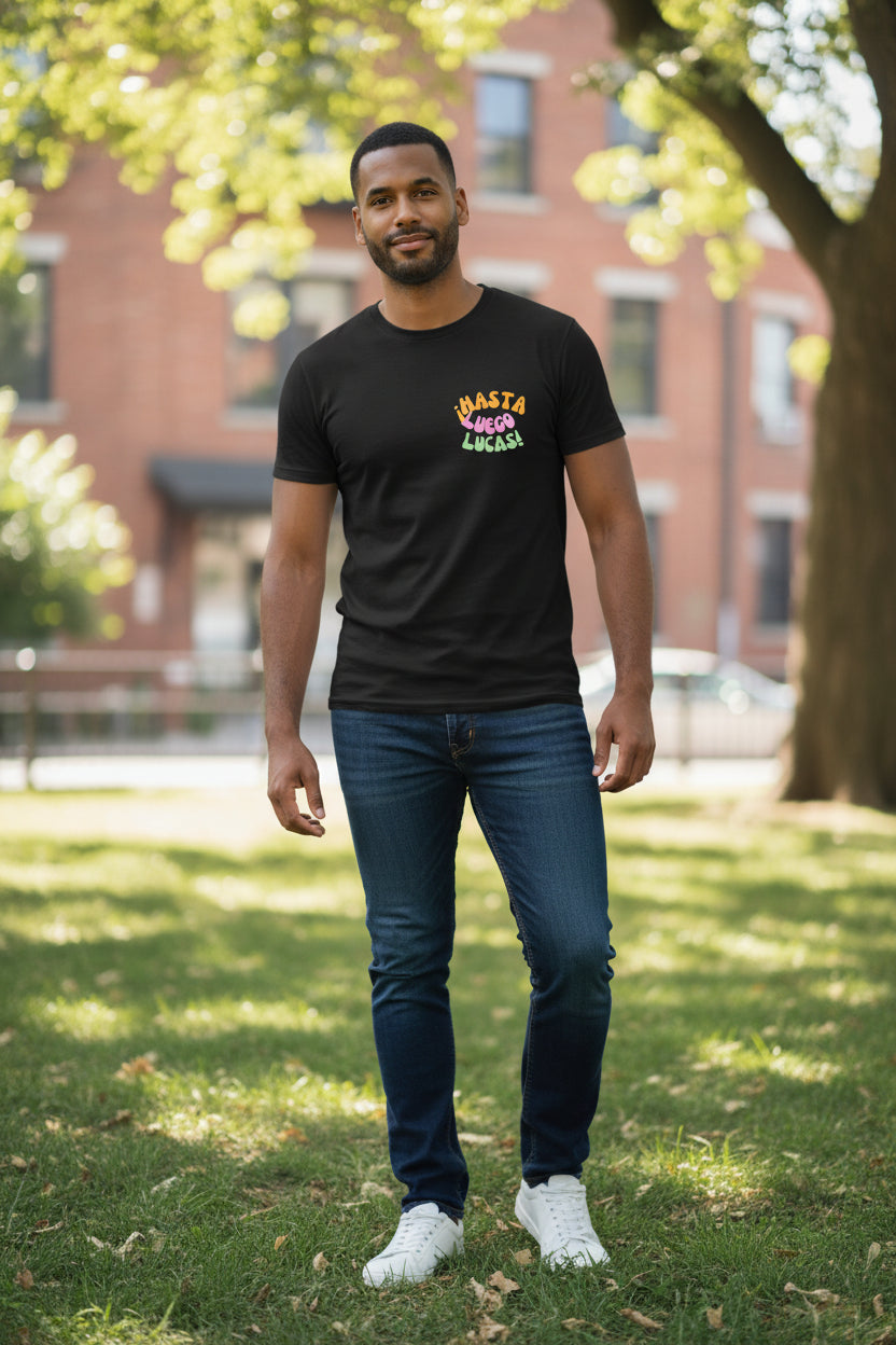 La camiseta !HASTA LUEGO, LUCAS! recupera una de las frases más míticas del lenguaje popular de los años 80 y 90. Una forma divertida y muy reconocible de decir adiós, sin dramas y con estilo.