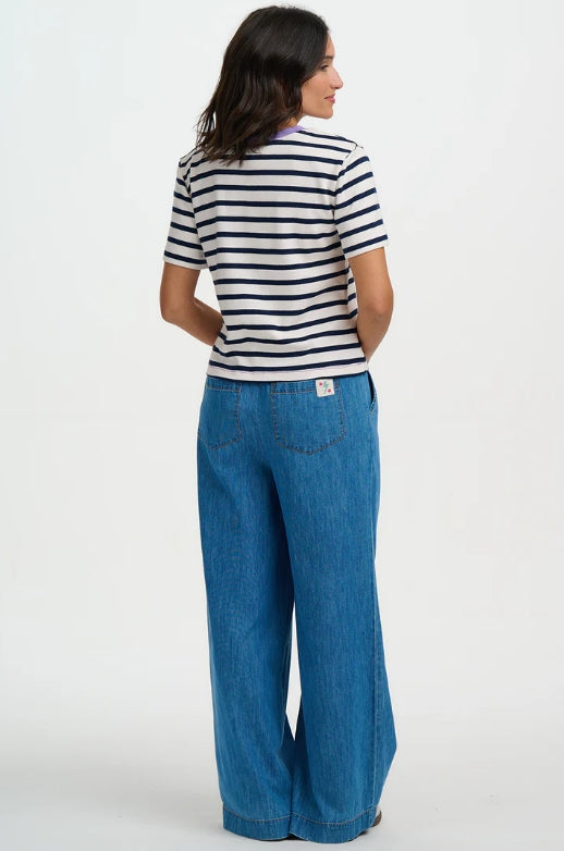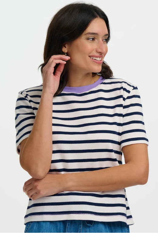 Confeccionado en algodón 100% orgánico, su tejido es más grueso, suave y transpirable, ideal para acompañarte durante todo el año. Su diseño de rayas clásicas en azul marino y crema se equilibra con un cuello redondo en contraste, que añade un sutil toque de color característico de Sugarhill.