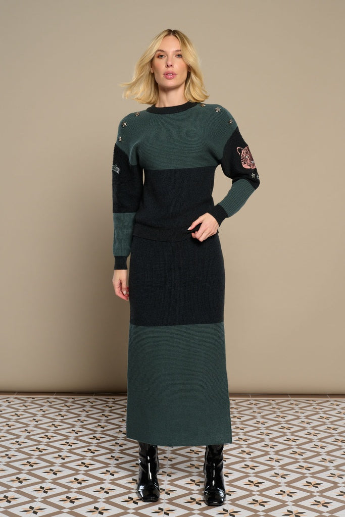 "Descubre la Micho Skirt de Minueto, una falda larga de punto para mujer confeccionada en tejido elástico que se adapta perfectamente a la silueta. Su diseño con abertura lateral añade un detalle moderno y favorecedor, ideal para dar movimiento y estilo a cualquier look.