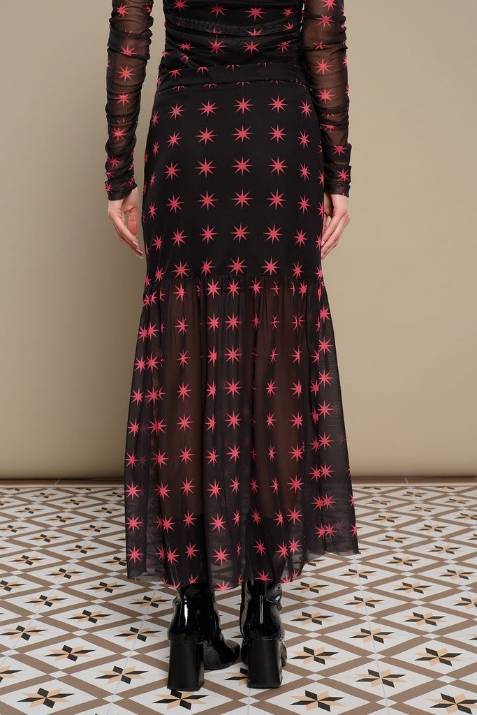 La Stella Skirt es una falda midi de estilo contemporáneo que destaca por su estampado de estrellas fucsias sobre fondo negro, una combinación que aporta personalidad y un aire sofisticado. Su diseño ajustado en la parte superior y con vuelo en el bajo crea una silueta femenina, elegante y moderna.